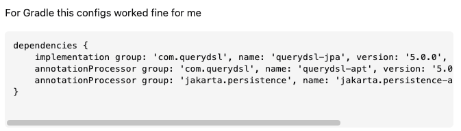 - gradle 프로젝트에서는 Querydsl 처리를 위해 annotationProcessor가 필요하고 com.querydsl:querydsl-apt 그룹 및 아티팩트를 dsl 버전 기입, :jakarta는 QueryDSL이 사용하는 모듈 시스템을 지정합니다. (java ee -> jakarta ee로 명칭을 변경했죠)